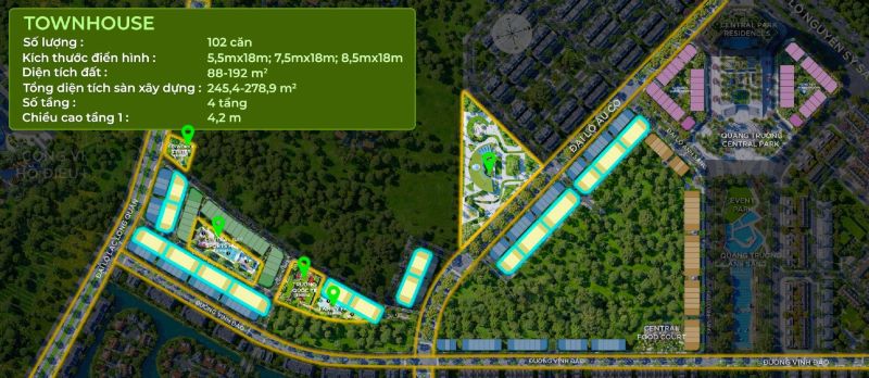 | Townhouse nhà phố thương mại | 88-192 m² | Diện tích sàn: 245-278.9 m² | 102 căn | 4 tầng | ... tỷ/căn |