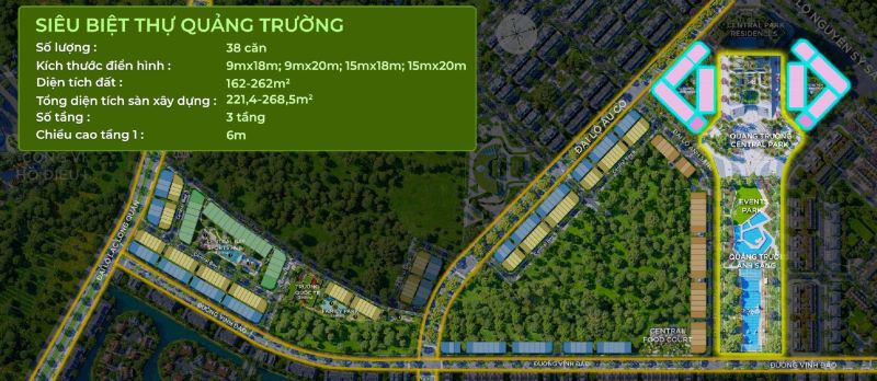 | Siêu biệt thự quảng trường | 162-262 m² | Diện tích sàn: 221.4-268.5 m² | 38 căn | 3 tầng | ... tỷ/căn |