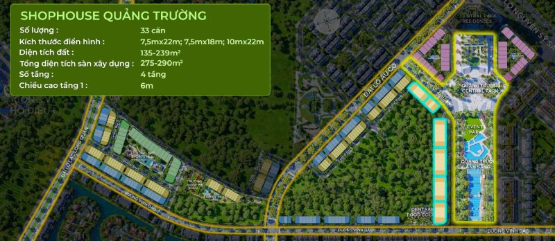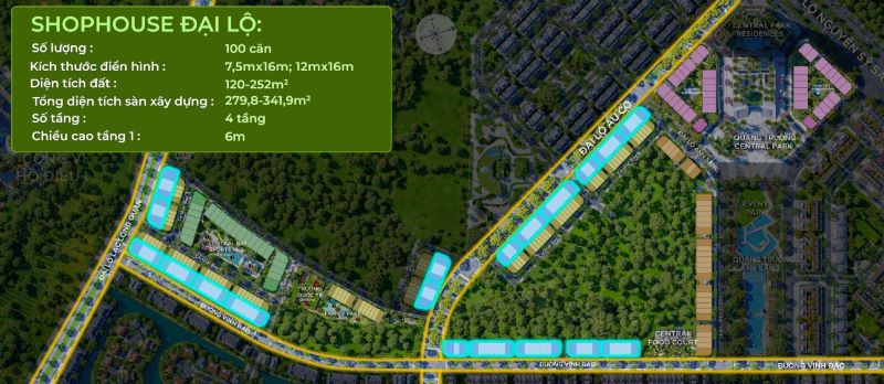 | Shophouse đại lộ | 120-252 m² | 65.5 m² | 100 căn | 4 tầng | ... tỷ/căn |